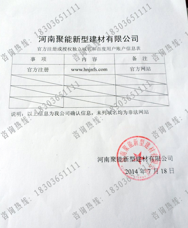 近發(fā)現(xiàn)一些非聚能內(nèi)部人員以我公司名義私自建立網(wǎng)站以及網(wǎng)絡(luò)推廣,在此提醒各位:咨詢(xún)請(qǐng)謹(jǐn)慎,購(gòu)買(mǎi)我公司產(chǎn)品更是謹(jǐn)慎,認(rèn)準(zhǔn)河南聚能新型建材有限公司唯一官方網(wǎng)站:http://m.xiaozhongdai.cn